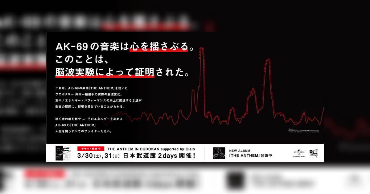 AK-69は、約2年半ぶりとなるニュー・アルバム『THE ANTHEM』を2月27日(水)に発売した。3月30日(土)・31日(日)には、自身初となる日本武道館2daysライブを開催する予定だ。そんな活躍中の彼が発信する「闘う男の代弁者」ともいえる曲中の熱いメッセージは、プロボクサー・井岡一翔選手や、横浜DeNAベイスターズ・筒香嘉智選手、ラグビー日本代表・庭井祐輔選手など、多くのトップアスリートからモチベーションを鼓舞すると、高く評価されていた。その鼓舞は実際にどうなのか?このたび、AK-69の楽曲がアスリートにどのような影響を生んでいるのかを検証するため、脳波測定実験が行われたようだ。